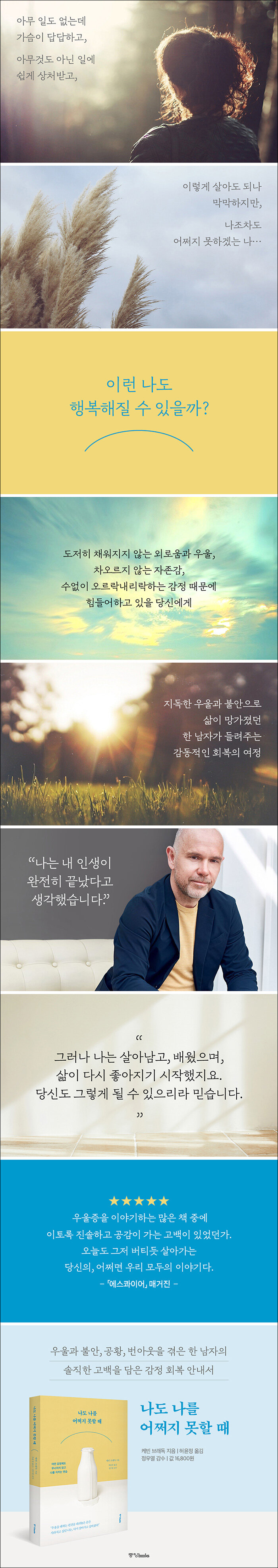 ★★★★★ 저자가 소개하는 회복의 방안들은 매우 실용적이고 구체적이라 비슷한 상황에 놓인 사람들에게 큰 도움이 되어줄 것이다. – 한국어판 감수자 정우열(정신과 전문의) 우리는 슬픔과 분노, 우울, 짜증, 불안을 느끼는 자신에게 지나치게 적대적이며 과하게 죄책감을 느낀다. 부정적인 감정을 떨쳐내야 할 것만 같은 조급한 마음이 실은 자신을 더욱더 괴롭게 만드는 줄도 모른 채 밀어내려고만 하는 것이다. 잘나가는 에디터로 일하며 바쁜 나날을 보내다가 우울증으로 갑자기 삶이 중단되어야 했던 저자 케빈 브래독은 결국 자살까지 시도하며 바닥으로 추락하고 말았다. 이후 정신과 전문의, 심리치료사들과 함께 회복의 과정을 통해 자기 자신조차 어쩌지 못하는 감정을 받아들이고 다스리는 법을 터득한 그는 본인만의 구체적인 회복 방안 12가지를 소개한다. 도저히 채워지지 않는 외로움과 우울, 차오르지 않는 자존감, 수없이 오르락내리락하는 감정 때문에 힘들어하는 사람들에게 이 책은 따뜻한 위로와 용기를 전하는 것은 물론 가장 현실적인 치유 지침서가 되어줄 것이다.