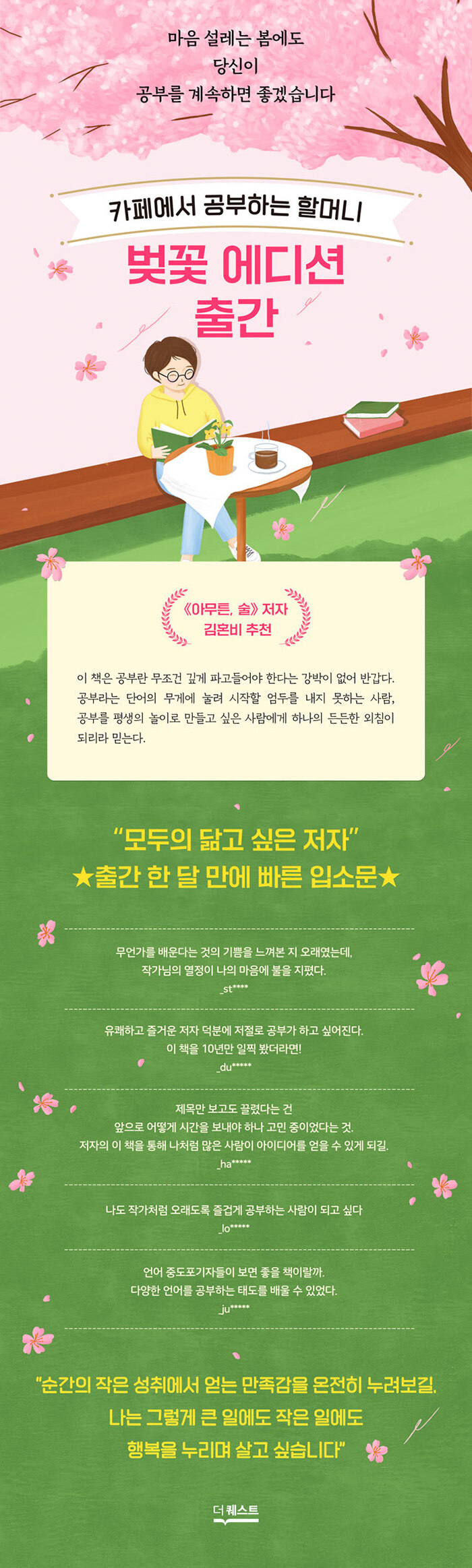 출간 한 달 만에 빠른 입소문을 타며 많은 인기를 얻은 《카페에서 공부하는 할머니》가 봄꽃 에디션으로 돌아왔다. 목표는 ‘열심히’가 아니라 ‘오래오래’, 하기 싫어지면 ‘엉덩이 힘’으로 버티기가 아니라 ‘잘 그만두는 법’을 선택하는, 12년차 번역가 심혜경의 공부 에세이. 김혼비, 하정, 최예선 등 젊은 작가들의 ‘왕언니’이자 ‘삶의 롤모델’로 꼽히는 그는 ‘해야 할 일, 하고 싶은 일에 따르는 모든 행위’를 공부라고 말한다. 수학과의 관계에 쌓인 앙금을 풀기 위해 《수학의 정석》을 다시 풀어보는 것도, 《어린 왕자》를 원어의 맛으로 느끼기 위해 프랑스어를 공부하는 것도, 스윙댄스나 바느질을 배우는 것도 공부다. 나이와 관계없이, 직업으로서의 일을 하지 않더라도 사회와 연결되기 위해 하는 모든 일은 공부다. 공부가 아닌 것은 없다.