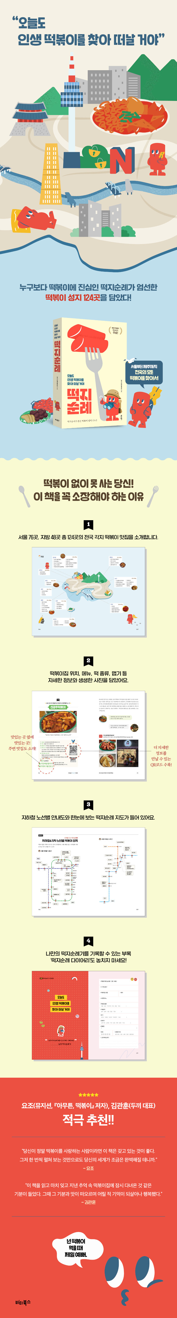 이 책은 떡볶이 맛집으로 소문난 곳이라면 전국을 가리지 않고 투어를 떠나는 인플루언서, 떡지순례가 엄선한 떡볶이 성지를 소개하는 책이다. 떡지순례가 직접 선정해 방문하고 맛보고 인정한 ‘인생 떡볶이집’ 124곳을 담았으며, 누구보다 떡볶이에 진심인 저자의 짧은 에세이도 함께 실었다. 물론 소문난 떡볶이집뿐만 아니라 나만 알고 싶은 곳, 신흥 강자로 떠오르는 곳도 수록되어 있다. 또한, 전국 각지 떡지순례 지도, 지하철 노선별 떡볶이 성지, 나만의 떡지순례기를 기록할 수 있는 부록 ‘떡지순례 다이어리’ 등 다양한 콘텐츠를 담아 떡볶이에 진심인 많은 사람의 호기심과 소장욕을 자극하기에 충분하다. 오늘도 인생 떡볶이를 찾아 떠나는 떡지순례자들에게 이 책을 바친다.