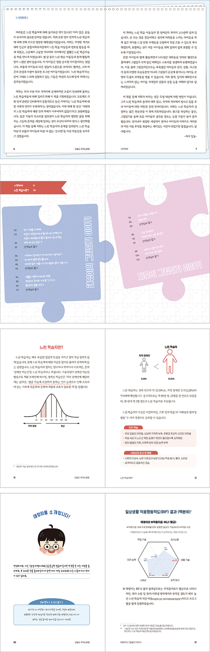 느린 학습 아동은 언제나 우리 곁에 있었지만 우리는 아이들을 제대로 인식하지도, 알아채지도 못했습니다. [오늘도 우리는 맑음]은 ‘그림일기’라는 소통 도구를 통해 느린 학습 아동의 특성, 사고방식 등을 독자에게 친근하고 유쾌하게 전달합니다. 각 아이만의 고유하고 빛나는 이야기들은 아이들을 새로이 인식하고, 오롯이 이해하는 데 도움을 줄 것입니다.
