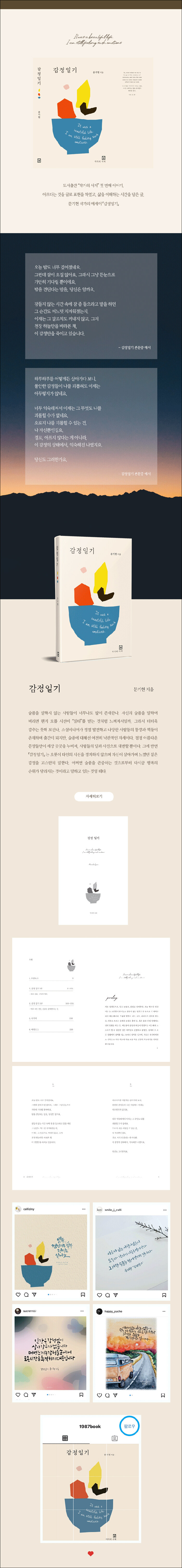 <두 번째 해설> 아프지 않게 사는 방법이 있다면 아마 그 사람이 가장 아픈 사람일 거예요. 세상의 정답을 가지고 있는 사람이 있다면 아마 그 사람이 가장 바보일 거예요. 그렇다. 너무나도 많은 전문가들이 난무하다. 실패하지 않고 일어서는 법이 어디 있겠는가. 슬프지 않고서 진정한 슬픔을 말하는 사람이 어찌 슬픔을 이해하겠는가. 『감정일기』 가 그러한 책이다. 이 책은 오롯이 슬픔과 삶을 대조해 짙은 감정을 남겨 살아가는 순간을 이해시키는 것을 말한다. 정답을 말하는 것이 아닌, 짧은 시간을 조금 더 소중하게 느껴가기 위한 감정을 말하는 것이다.