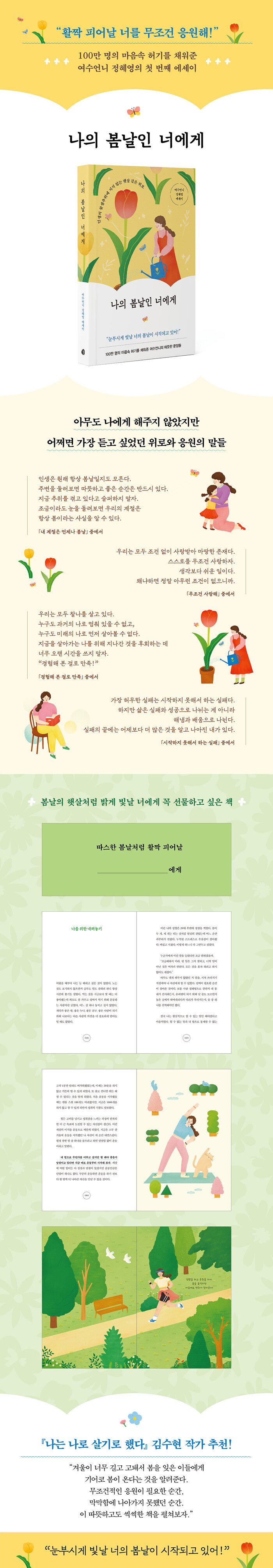 이 책은 인생의 꽃샘추위에 지지 않는 햇살 같은 위로를 담있다. 숱한 시련과 좌절 속에서도 자존감을 단단히 쌓아올린 여수언니는, 이제 이전의 자신과 같은 사람들에게 스스로를 사랑하며 한 발짝만 더 내딛어 볼 것을 권한다. 춥고 시리기만 한 계절은 없고 영원한 어둠은 없다. 얼음을 깨고 차가운 바람을 뚫고 소리 없이 찾아오는 봄처럼 활짝 피어날 당신의 봄날도 어느새 곁에 성큼 다가와 있다. 여수언니의 응원은 언제나 당신을 향해 있다. 스스로에게 ‘다른 누구도 아닌 나 자신에게 따뜻한 사람’이 되어주라고 말한다. 무조건적인 격려와 위로가 절실할 때, 이 책은 화창한 봄날의 선물이 되어줄 것이다.