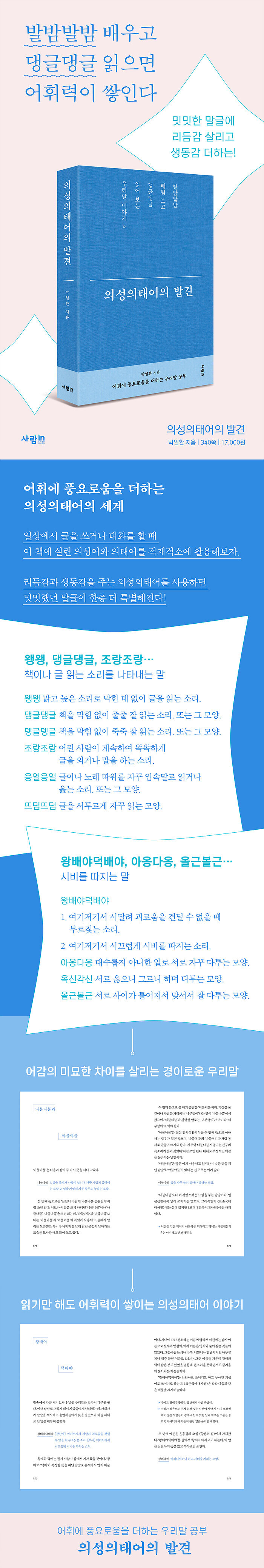 말이란 부리기 나름이지만 무엇보다 입에서 입으로 옮겨 다니며 사랑받아야 한다. 그렇지 않으면 시들시들 힘을 잃다가 시나브로 자취를 감춰버리고 만다. 아쉽게도 국어사전 안에만 갇혀 있는 의성의태어가 무척 많다. 이 책에서는 너무 잘 알려진 낱말은 빼고, 의미 있는 분석과 해설이 가능한 낱말 중심으로 엮었다. 아쉬움을 달래기 위해 독자들이 알아두면 좋겠다 싶은 의성의태어를 모아 부록으로 첨부했다. 어감의 미묘한 차이를 살리는 경이로운 우리말, 의성의태어